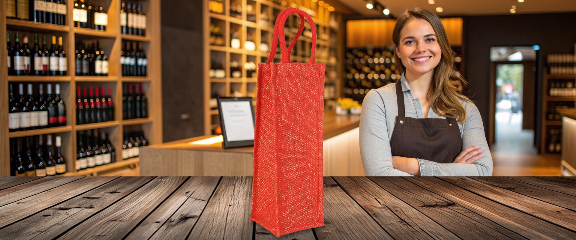 Unsere schöne Einzelflaschentasche in roter Jute mit goldener Faser eingewebt. Die ideale, nachhaltige Geschenkverpackung. Die Innenbeschichtung aus recyceltem Altkunststoff macht die Tasche auswischbar und weniger anfällig gegen Verschmutzung.
