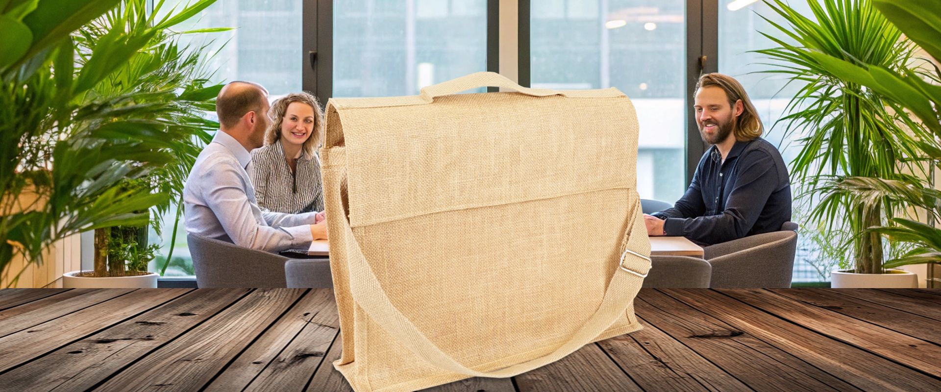 Unsere Jute-Dokumententasche oder Laptoptasche ist der nachhaltige Begleiter für Ihre Mitarbeiter und Ihre Kunden. Die Tasche hat eine Klappe mit Klettverschluss und einen in der Länge verstellbaren Schultergurt (maximal 120 cm). Sie ist belastbar und durch die Innenbeschichtung aus recyceltem Altkunststoff macht die Tasche auswischbar und weniger anfällig gegen Verschmutzung.