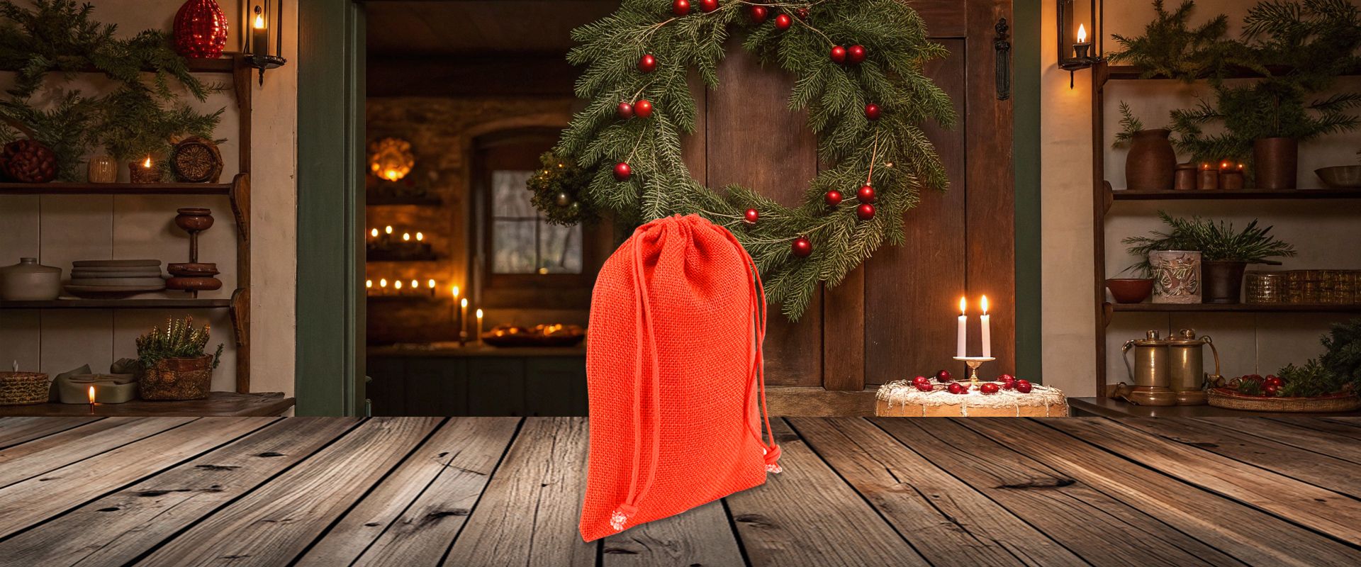 Unser kleines Jutesäckchen im weihnachtlichem Rotton mit roter Baumwollkordel.