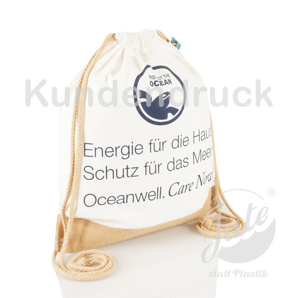 Unser stylisher Turnbeutel aus starker 320 GSM Fairtrade Baumwolle in einem schönen, hellen Naturweißton in Kombination mit feinem Jutegewebe und Baumwollkordeln in Jutefarbe - mehr als nur ein Werbemittel, sondern aktuell ein echter Trendsetter. Die Kordeln harmonieren wunderbar mit der goldenen Jute und der naturweißen Baumwolle. Der Turnbeutel besticht besonders durch den schönen Materialkontrast und ist durch die beschichtete Jute im unteren Bereich auch besonders formstabil.